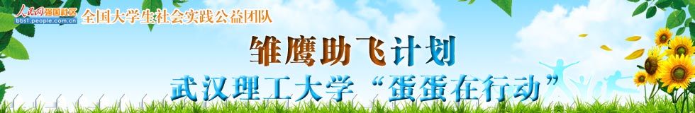 武漢理工大學(xué)“蛋蛋在行動(dòng)”成立于2011年12月,是一支致力于開(kāi)展包括支教在內(nèi)的公益活動(dòng),援助山區(qū)貧困學(xué)生的公益團(tuán)隊(duì),目前擁有成員89人。2年多來(lái),舉辦的活動(dòng)有暑期支教、蛋蛋公益文化周、暖冬行動(dòng)、聯(lián)合余區(qū)六院青協(xié)為胡夢(mèng)婷募捐、愛(ài)心義賣等活動(dòng),吸引廣大師生參與,累計(jì)覆蓋人數(shù)超過(guò)一千人,募集款項(xiàng)18738.42元、物品五千余件。