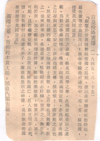 1945年8月15日日本天皇投降廣播詞。這篇文告是告訴自己的老百姓(忠良臣民)的。其中對(duì)于發(fā)動(dòng)戰(zhàn)爭(zhēng)的罪責(zé)不但沒有一個(gè)字的自責(zé),而且指“敵使用殘虐炸彈,頻頻殺傷無辜,慘害所及,誠(chéng)不可測(cè)。”和十余年后所發(fā)現(xiàn)的東條英機(jī)遺囑的惡劣態(tài)度如出一轍。廣大網(wǎng)友不放回頭看看2013年12月12日18:21:31《歷史鐵證日本400年侵華野心,讓我們恨搗靖國(guó)神社內(nèi)幕吧!》一文中東條英機(jī)的遺囑。