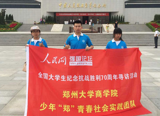 7月16日,鄭州大學(xué)“少年鄭青春”暑期實踐隊,開展了“緬懷革命先烈,樹立信心實現(xiàn)中國夢”實踐活動。團(tuán)隊通過抗戰(zhàn)知識調(diào)研、參觀抗戰(zhàn)紀(jì)念館、采訪抗戰(zhàn)老兵、向幼兒園孩子普及抗戰(zhàn)知識等方式紀(jì)念抗戰(zhàn)勝利70周年。