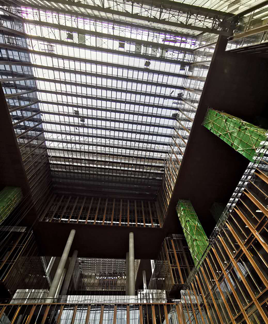 “傳統(tǒng)的腳手架是從下往上搭建,但經(jīng)過我們亞投行項目青年員工的創(chuàng)新,改為從上往下搭建,改變了架體的結(jié)構(gòu)形式,將本來需要60米高的滿堂架改為3米高的吊掛架,成功解決了首層樓板對架體承載力不足難題。” 31歲的項目總工程師劉瑞軍每每談到創(chuàng)新使用吊掛腳手架裝修大跨度采光頂幕墻時,都神情飛揚,同時感慨萬千。
